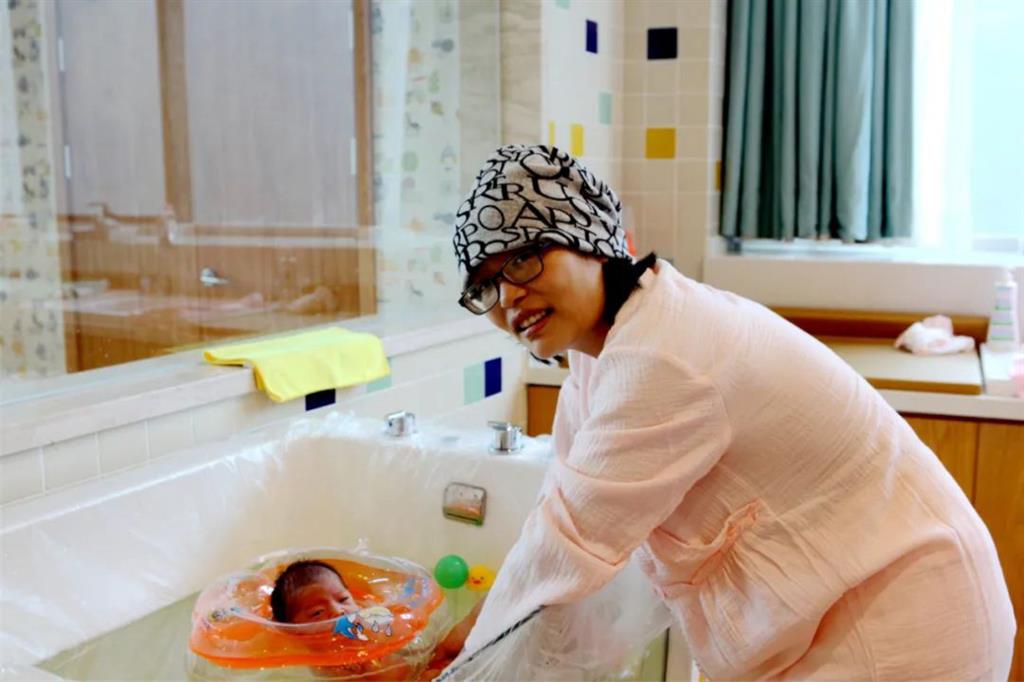 剛生完孩子我的腰還是有點痛的,到了第三天狀態(tài)就好了很多,護士長帶寶寶去洗澡、游泳,還幫我叫來了擅長看骨科的周健副院長,周醫(yī)生還逗了逗我家的老大。