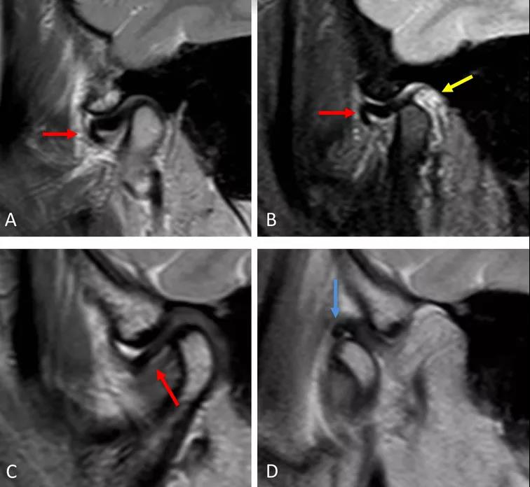 B圖示:張口位時,顯示關節(jié)盤移位(紅色箭頭),關節(jié)積液(黃色箭頭)。病例2:斜矢狀平面上的質(zhì)子密度加權圖像(PDWI)