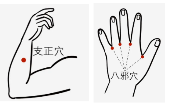 1.按揉支正穴。支正穴位于人體前臂背面尺側(cè),從手掌根往上5寸(約6個橫指的距離),在肉和骨頭的中間,摸到骨縫里的痛點(diǎn)。2.摩擦八邪穴。位于手背第1~5指間指蹼緣后方赤白肉際處,左右共8穴。