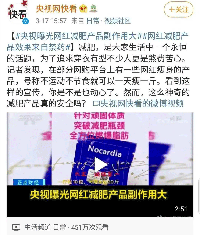 一次是央視報(bào)道,有人從閑魚(yú)上買(mǎi)減肥藥,買(mǎi)了之后雖然有效,但是副作用很大,經(jīng)過(guò)檢測(cè)里邊含有非常高劑量的西布曲明。